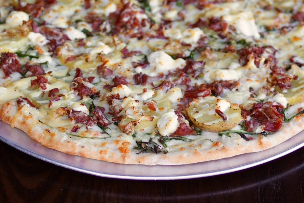 dam's Waikiki starts with roasted habanero pineapple coconut milk sauce, our signature four-cheese blend, Waikiki sausage from Adam’s Meat Shop, red onions, red bell peppers, pineapple, mango habanero sauce, and topped with green onions.